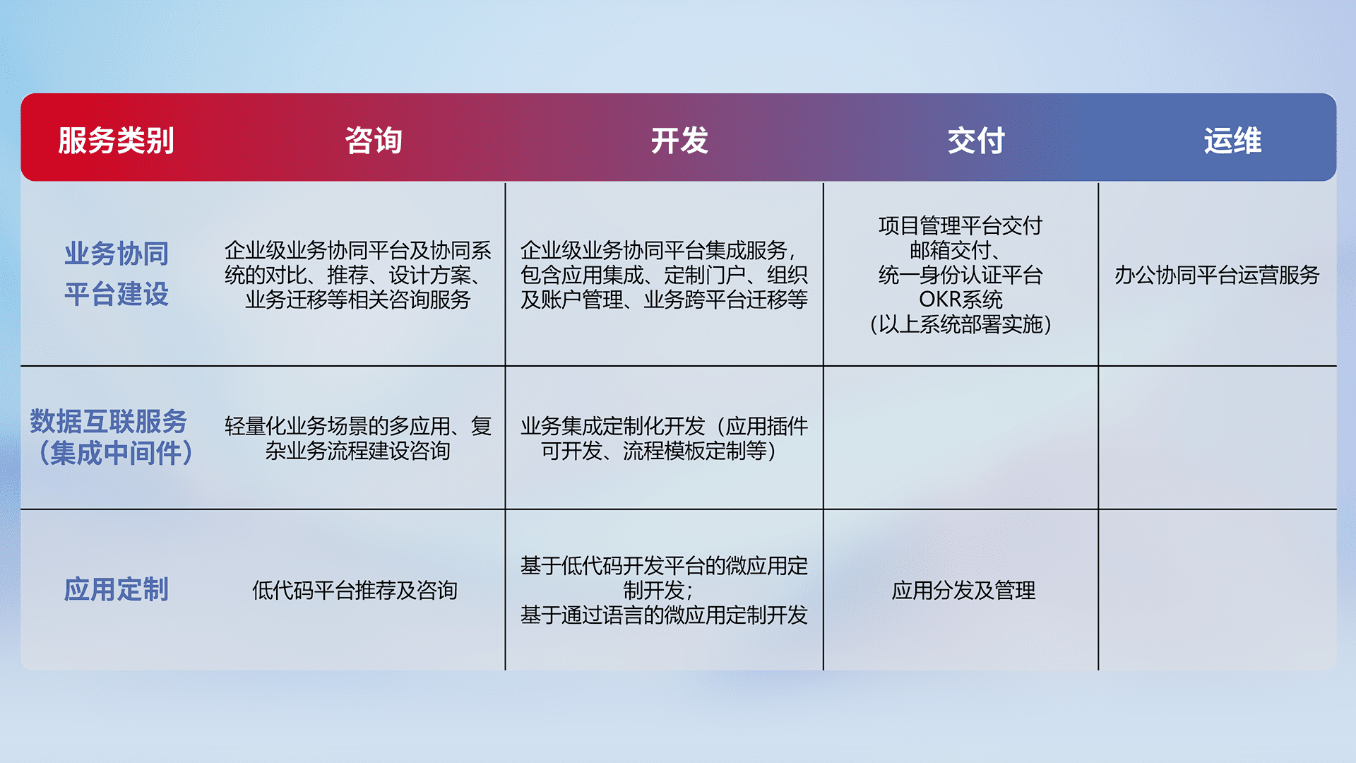 针对钉钉、、、企微、、、、IDaas等平台级产品提供产品的规划、、、、方案、、、、交付、、定制化开发等服务,,实现如统一协同办公、、、智能客户服务、、混合会议管理、、智能数据查询、、等业务场景,,实现数字化转型。。。