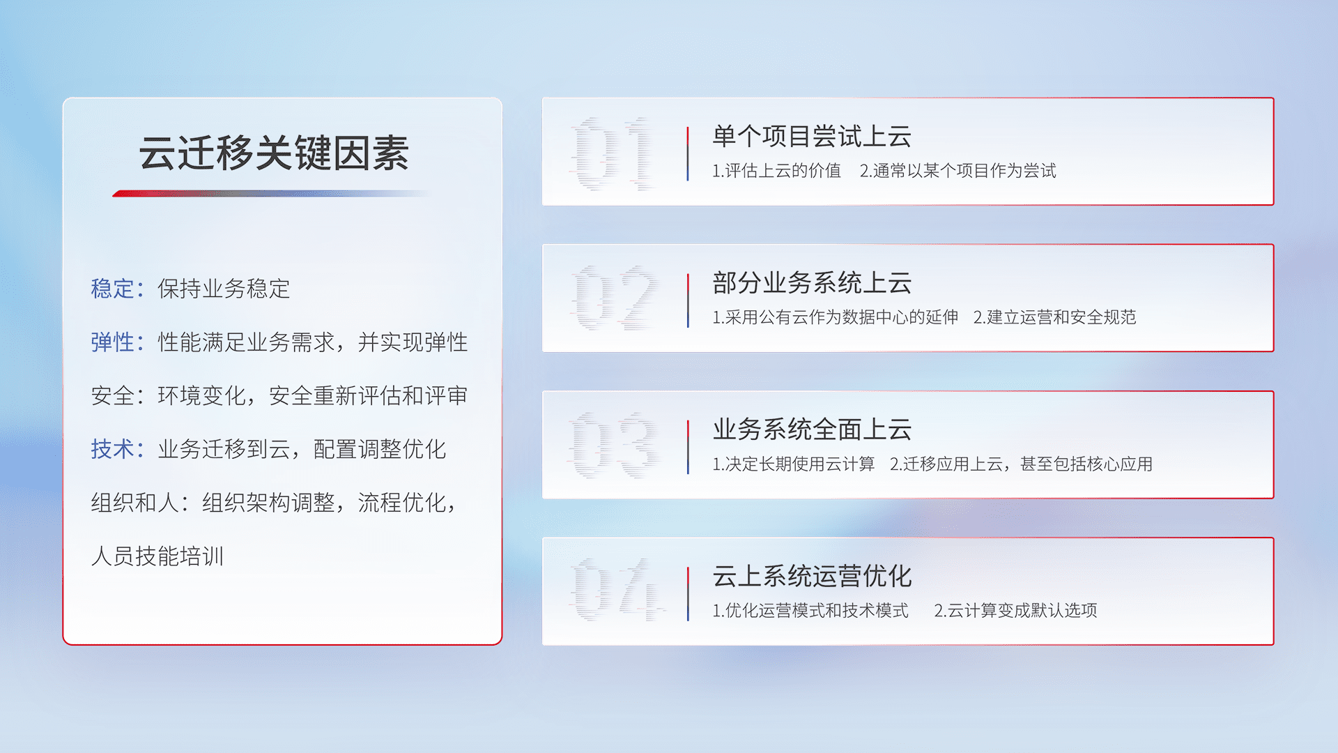 结合实际业务,,,从规划设计、、、、云平台选型、、、云原生改造、、数据迁移、、、集成交付,,,迁移全过程为客户识别最佳上云路径,,,,做好风险识别管理,,,设计网络架构、、、、身份权限、、、、安全审计合规、、、操作审计、、、、日志审计、、、、监控告警策略、、、多站点容灾设计等,,,,对云上基础设施进行整体规划,,,提升IT治理水平,,以满足弹性、、高可用、、、高性能的需求。。。