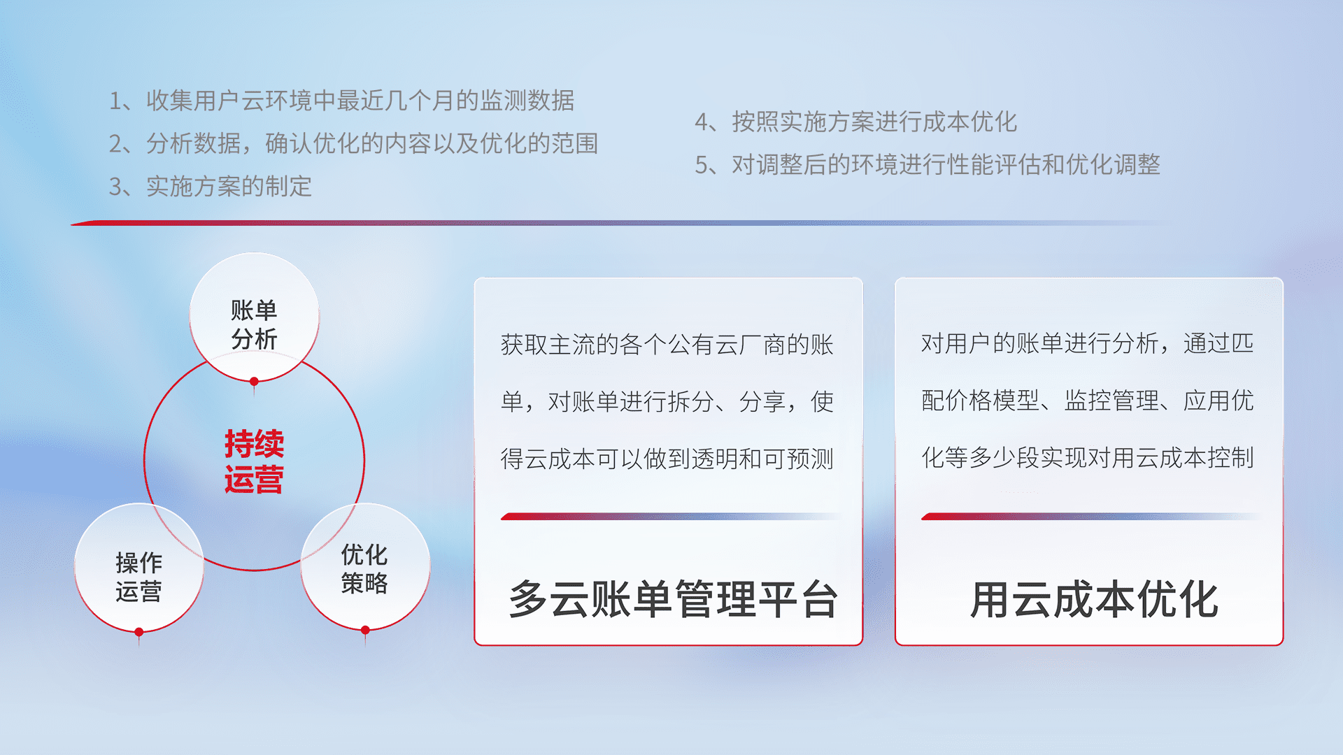 通过多云纳管,,,,以统一的资源数据模型把客户的云资源进行抽象和封装,,进而实现对多云资源的统一操作,,,,保障云资源管理的可靠性、、、稳定性与可用性。。。量身定制化运维内容,,配置、、、、开发运维、、、补丁管理、、、备份、、监控、、、认证和访问管理、、、审计和日常巡检等,,保障在用云过程中的可靠度,,稳定度以及高可用率。。。