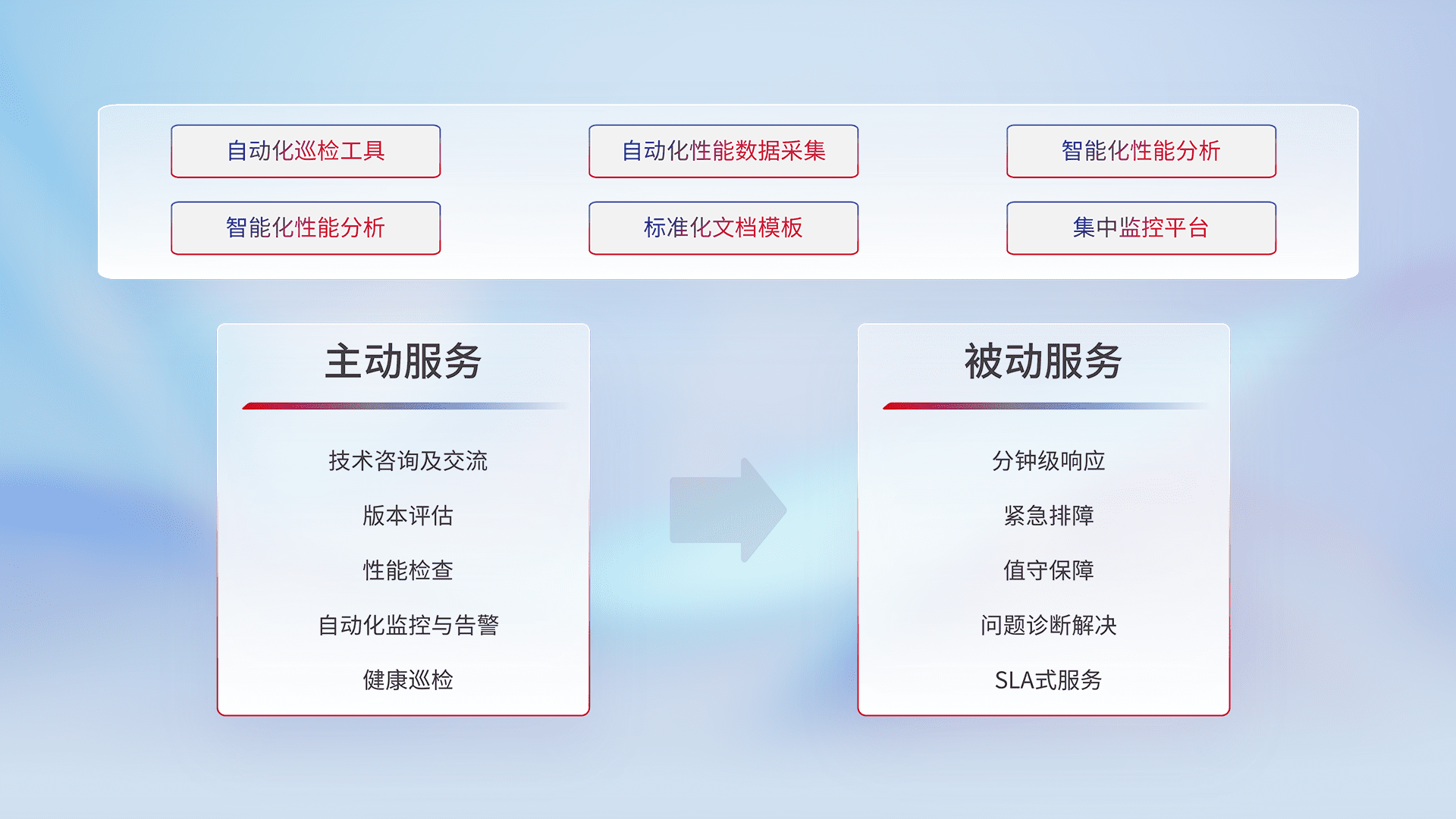 智能化工具和标准化文档,,,,保障服务质量,,,,提供主动服务(包含技术咨询、、版本评估、、性能检查、、、自动化监控与告警、、、健康巡检)和被动服务包含(分钟级响应、、紧急排障、、、值守保障、、、、问题诊断解决、、、、SLA服务)。。。